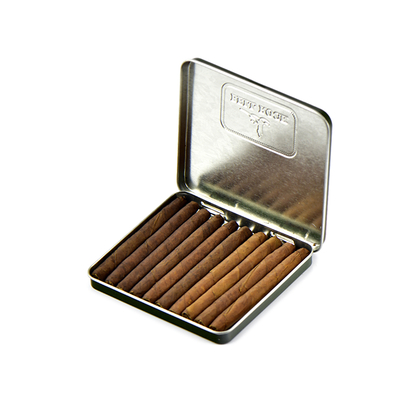Сигариллы упакованы в металлический портсигар, благодаря которому они сохраняют свои первоначальные вкусовые характеристики. Покровный лист: Ecuador (Habano);
