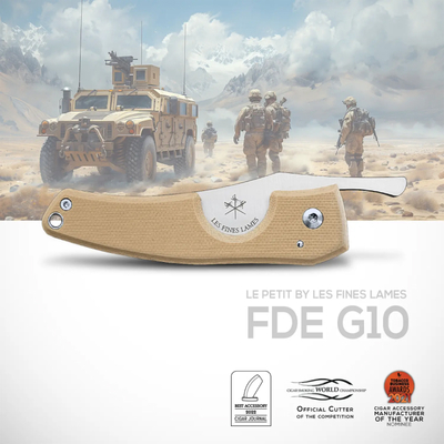 Сигарный нож FDE G10 изготовлен из очень эластичного материала G10, полученного из многослойного стекловолокна в смоле. Новая текстура рукояти обеспечивает удобный захват, а ровный темно-коричневый цвет придает изделию нотку тактической элегантности.