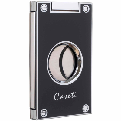 Сигарная гильотина от французского бренда Caseti. Действует по традиционному принципу гильотин — двойное лезвие в металлическом корпусе раскрывается пластинчатой пружиной при нажатии на кнопку. Для сигар диаметром до 21 мм. Фирменная подарочная коробка.