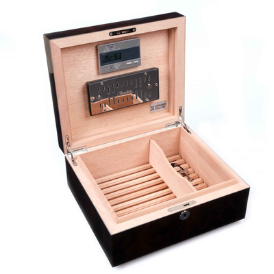 Хьюмидор премиум-класса на 50 сигар от американской компании Howard Miller — известного производителя предметов интерьера. Массивное изделие со строгим классическим дизайном и качественным исполнением. Внутренняя отделка из испанского кедра. Корпус отделан тонированным шпоном Камфорного дерева и многослойным глянцевым лаком. В комплекте с хьюмидором Howard Miller идут увлажнитель с акриловым полимером последнего поколения и шторками для поддержания оптимального уровня влажности, а также высокоточный электронный термогигрометр, которые крепятся в любом месте на крышке благодаря скрытой под кедровым шпоном магнитной пластине. Cъёмная кедровая решетка на дне хьюмидора для равномерного увлажнения сигар и вентиляции по всему объему, замок с ключом, подробная инструкция по эксплуатации. Производитель оставляет за собой право без предварительного уведомления вносить незначительные изменения в конструкцию или комплектацию изделия с целью улучшения его свойств.