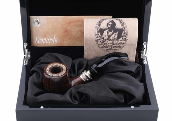 Трубка Ser Jacopo Leonardo оригинальной конструкции была создана Джанкарло Гуиди (Giancarlo Guidi) по мотивам работ Леонардо да Винчи. Известно, что Леонардо сделал для Тосканского герцога керамическую трубку с двойными стенками для прохладного курения. Джанкарло разработал аналогичную, но уже из бриара: в стенках чашки сделана кольцевая проточка, закрытая сверху серебряной крышкой с отверстиями для отвода тепла. Таким образом, двойные стенки с воздушной прослойкой сохраняют поверхность трубки комфортной для руки. Кольцо на чубуке модели Delecta из серебра с гравировкой Ser Jacopo и выбитой пробой 925. На чубуке снизу и по бокам выбит девиз мастерской PER ASPERA AD ASTRA («Через тернии к звездам», лат.), маркировки: Ser Jacopo, Hand made in Italy, градация L1, серия Delecta Leonardo. В комплекте итальянская подарочная шкатулка в черном глянцевом лаке, кисет для трубки и буклеты компании Ser Jacopo.