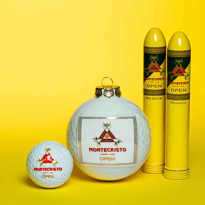 Новый уникальный новогодний набор 2024 года включает в себя две сигары Montecristo Open Regata (46 сепо х 135 мм в длину, фабричное наименование Forum), линейки Línea Open, фарфоровый новогодний брендированный шарик и брендированный гольф-мяч.