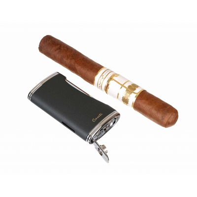 Новая сигарная турбо-зажигалка Caseti с широкой форсункой. Идеально подходит для розжига сигар благодаря мощному турбо-пламени шириной 17 мм. В корпус встроен пробойник диаметром 8 мм. Размер 75x40x16 мм. Фирменная подарочная коробка, чехольчик для хранения и буклет от компании Caseti.