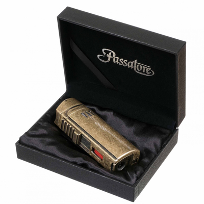 Зажигалка сигарная Passatore - тройное пламя, с пробойником и сигарным ложементом, Сигарная газовая зажигалка Passatore с мощным тройным турбо-пламенем и встроенным пробойником диаметром 8 мм. Зажигалка может служить также подставкой для сигары, благодаря плоскому дну и ложементу на крышке. Отделка — металл с анодированием «античная медь». На корпусе имеется окошко уровня топлива. В комплекте подарочная упаковка и инструкция по эксплуатации.